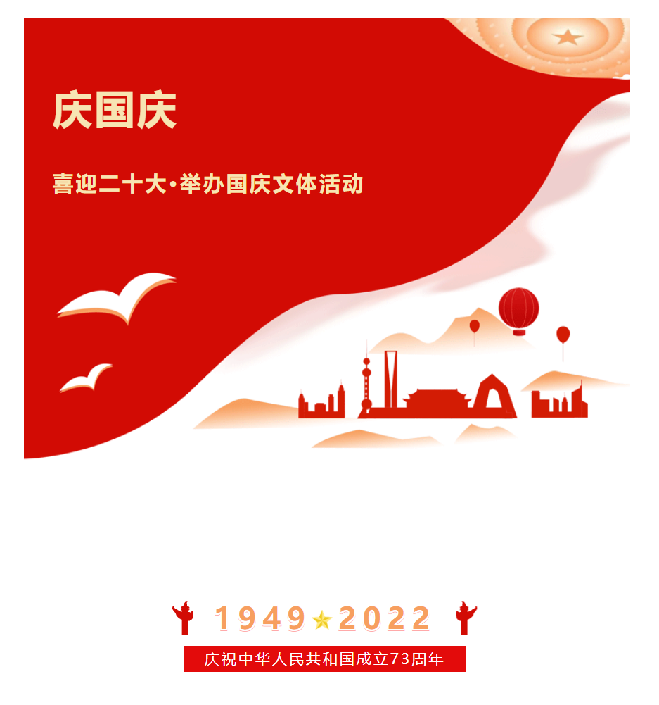 金秋送爽,硕果飘香,为喜迎二十大、庆祝建国73周年,进一步丰富员工的文化生活,营造浓厚的节日喜庆氛围,增强沪千团队的向心力和凝聚力,创造积极健康的工作氛围和环境,弘扬奋发向上的企业正能量,cq9电子平台网站决定举办国庆文体活动。